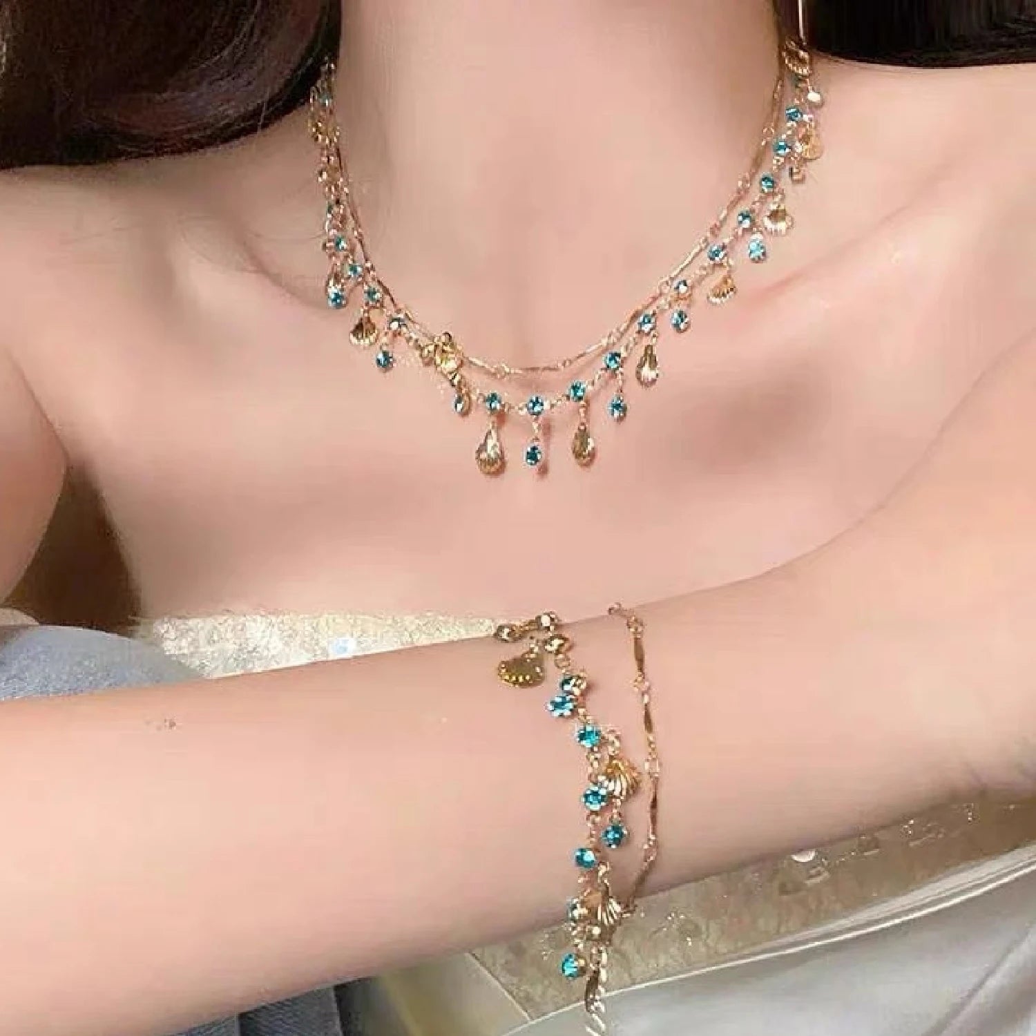 Elegant Gold Color Chain Shell Blue Tear Jewelry Set Crystal Choker Necklace Bracelet For Women Wedding Jewelry Birthday Gift