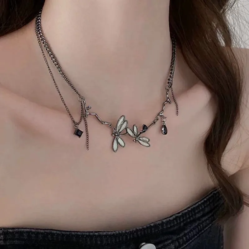 Y2K Dragonfly Necklace for Women Fashion Hip Hop Black Crystal Pendants Necklaces Splicing Chain Girls Rave Gift Gothic Jewelry